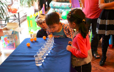 2、游戏道具: ①两张长桌子; ②一次性纸杯6个(注:游戏前,在前5个杯子装满水,最后一个杯子装半杯水); ③乒乓球5个(可以准备更多,以备用); ④秒表(计时); ⑤抹布若干(游戏结束时,清理桌面);