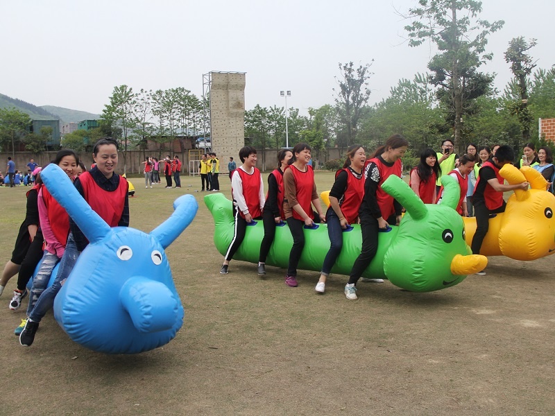 3、队员骑上毛毛虫游戏道具后,每位队员需紧抓左右两侧的把手,然后提起毛毛虫游戏道具,让毛毛虫游戏道具在不接地的情况下,快速抵达终点,先到者为胜。