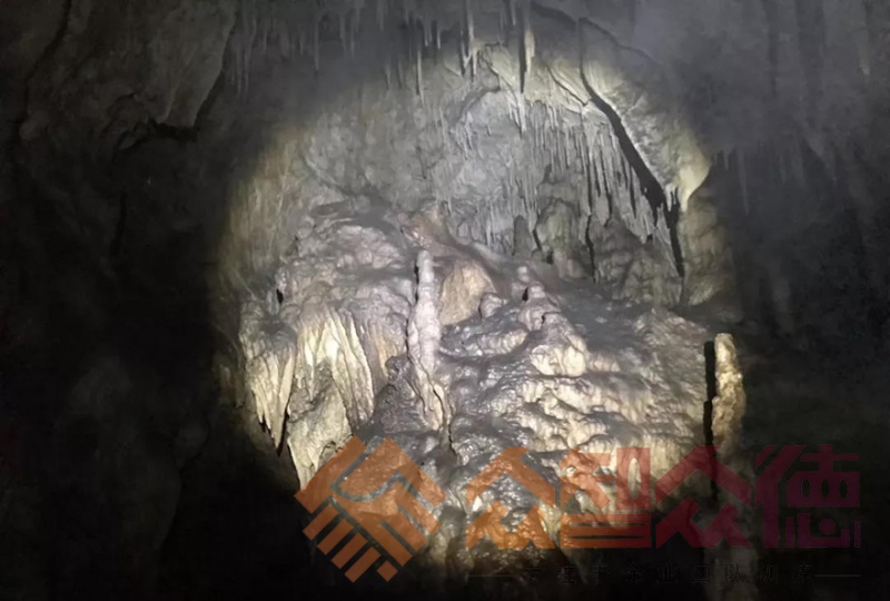 下到第二层洞底,观看景色的同时,以为这就是本次的结束,还在感叹没有尽兴的时候,忽然发现前方头顶4m的位置,镶嵌着一块巨大的岩石,明显是塌方后卡在石缝里的,通过石缝可以看到后面隐约有空间存在,于是李领队向上攀爬,发现了熊骨洞最美最震撼的洞庭,足有300平米的巨大溶洞洞厅!!!