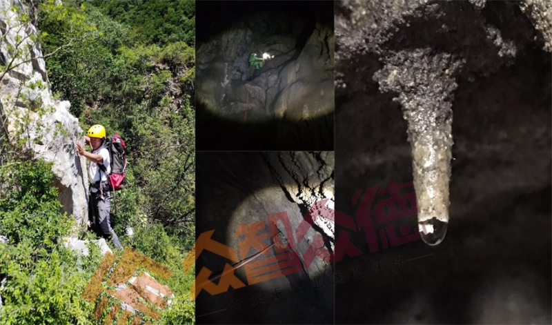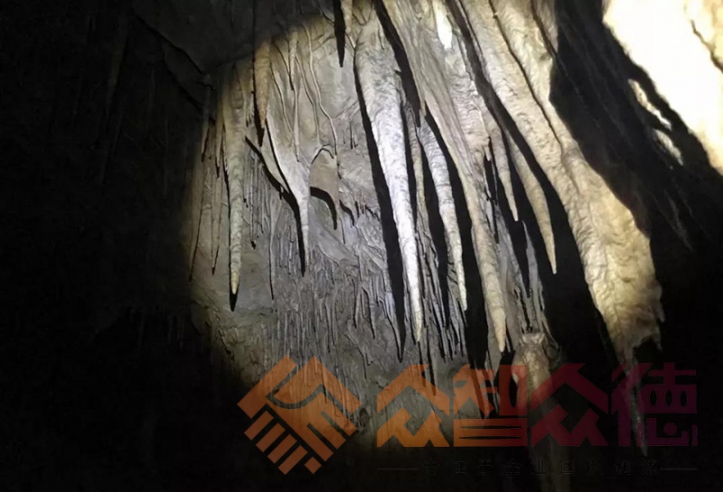 洞口的平台可以容纳十几个人休息,进入洞穴,首先就要面临一段狭窄的洞口,需要完全匍匐前进,体重超过180斤的伙伴就有点费劲了。穿过这段狭窄的隧道,也就来到了我们的第一个下降点,熊骨洞洞穴一共三层下降,一层爬升,下降为大角度接近垂直的斜坡,由于石盾非常光滑,岩壁凹凸陷入不均,下降还是有点难度的。第一层下降完,开始第二层下降之旅,第二层下降的半空中有一小平台,进入之后才发现真是美不胜收,也是这一层最好看的景色,里面密集的钟乳石,像一根根细长的山药倒挂在洞顶。