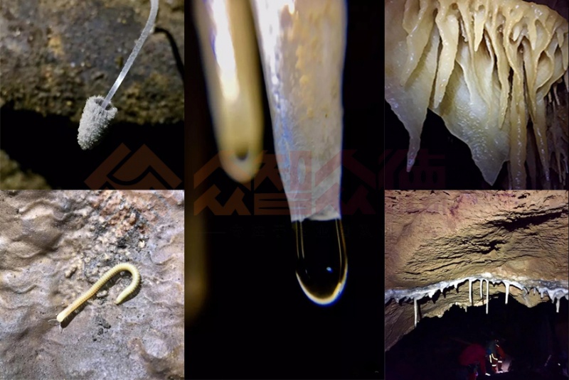 唐人洞洞穴分为三层,是以三个竖井通道联通,第一层竖井深约6m左右,第二层为40m左右,第三层为12m左右,第一层事一个小平台,能容纳五六个人,平台下方是一个半米直径的洞口,继续通往第二层,这是唐人洞最大的一段下降。下降到第二层平台后稍走一小段,就来到了第三个竖井处,此处约12m的下降基本是悬空垂直下降,基本上来说还是比较舒适的。到达第三层平台后大家尽可脱去身上的装备,开始准备进入最让人振奋的环节—领略唐人洞的盛世美颜。